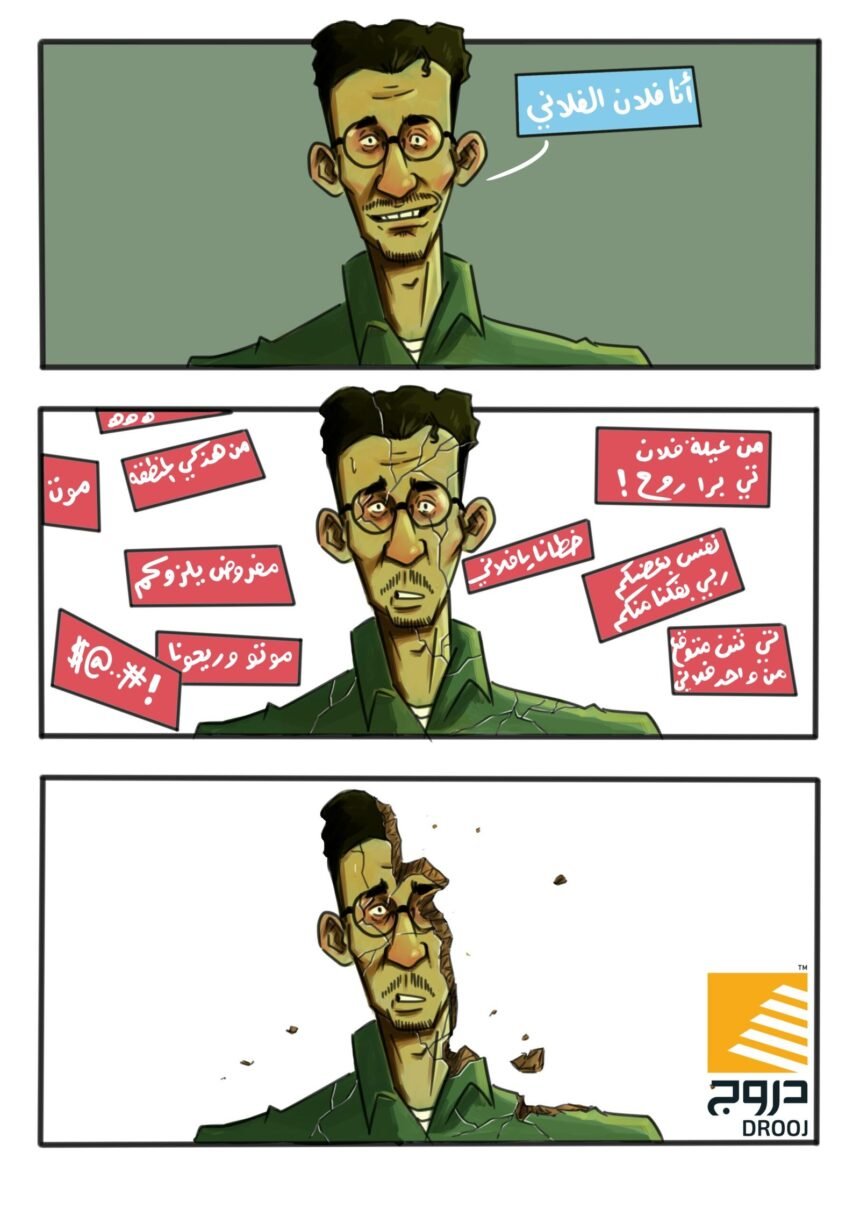 يعرض هذا الكوميك خطاب الكراهية، الذي قد يتعرّض له أيّ واحد منّا لمجرّد نشره صورته أو اسمه أو أيّ شيء عنه، لتنهال عليه جملة من التعليقات السلبيّة، وبعضها قد يكون متخفيا بالضحك والسخرية. خطابٌ كراهية قد يسبّب في النفس جروحا عميقة، قد لا تلتئم أبدا.